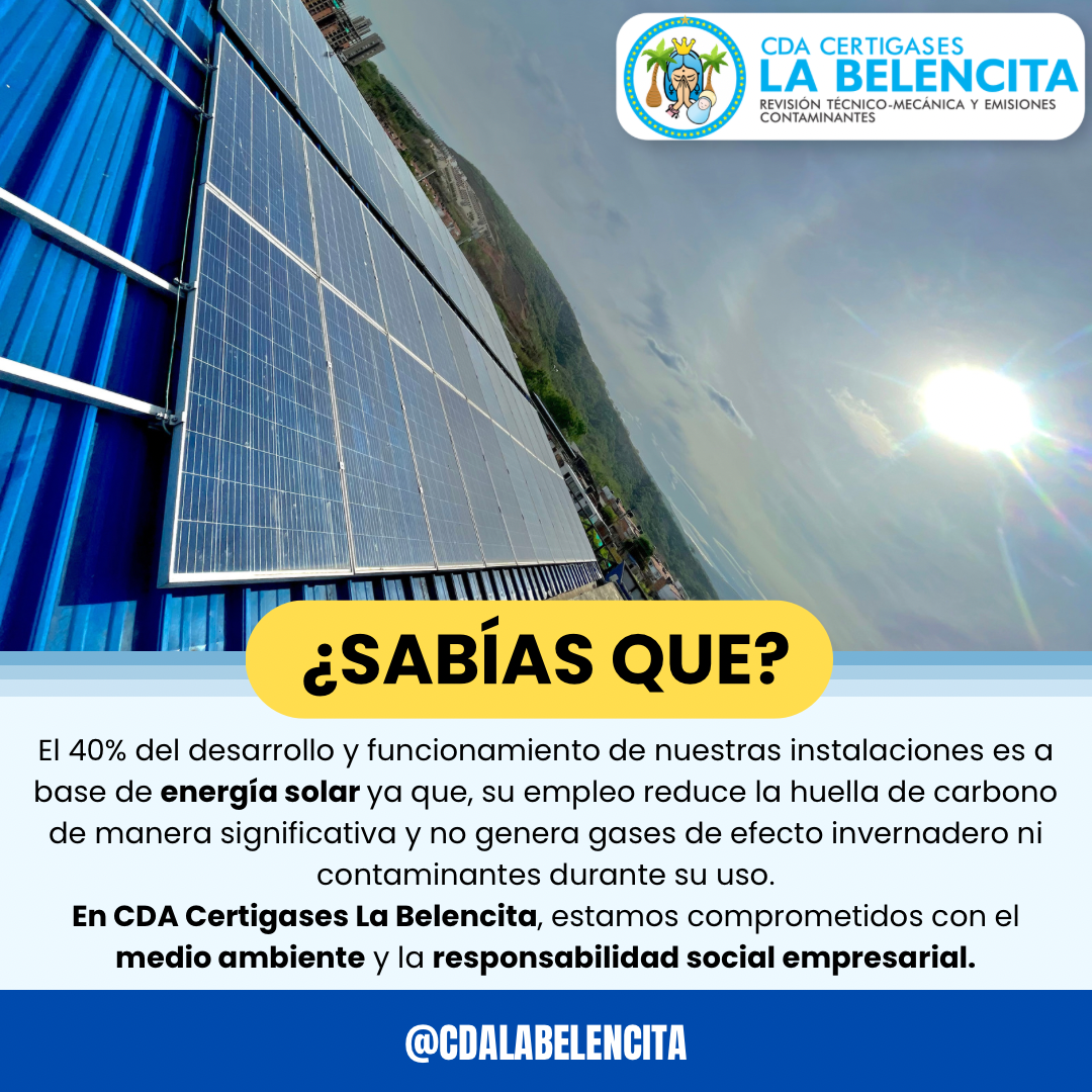 ¿SABÍAS QUE? El 40% del desarrollo y funcionamiento de nuestras instalaciones es a base de energia solar ya que, su empleo reduce la huella de carbono de manera significativa y no genera gases de efecto invernadero ni contaminantes durante su uso.